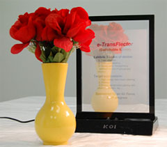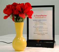 Made from a special liquid crystal material, the switchable mirrors have an electrically variable transmittance or reflectance. By altering the liquid crystal material formulation, the mirrors can be fabricated to operate from the visible to midwave IR. Their reflection bandwidth can also be arbitrarily tailored to vary from a few nanometers to a few micrometers. The mirrors are a semi-solid state thin film device, and can be rapidly switched between the pure reflection, half-reflection and total transparent states through a push button. The mirrors offer customers a switchable reflective shutter for vast applications in photonics apparatus and instruments. Examples of the possible applications include variable apertures and zoon optics in imagers and displays. A recent ABC News report shows an automobile rear view video mirror made with our switchable mirror. more>>